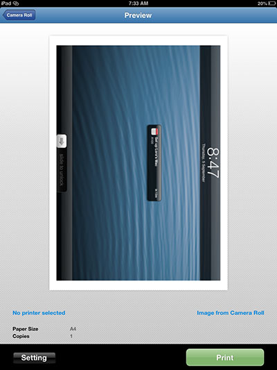 There is no AirPrint setup on campus, so printing directly from the iPad's print window is not available. To use the GREEN queue, you will first need to install the Samsung Mobile Print App: